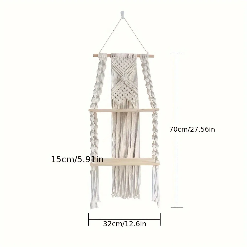 Bohemian Macramé Wall Shelf-Handmade Rope Hanging Storage with Wooden Plank,Decorative Tassels & Beads