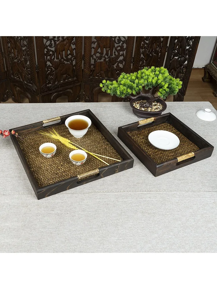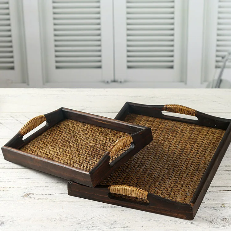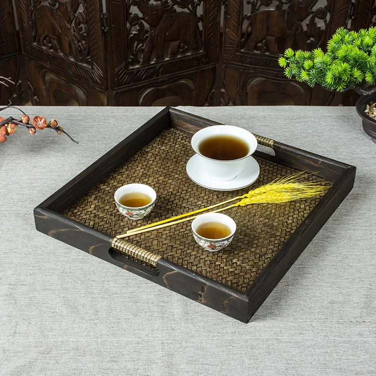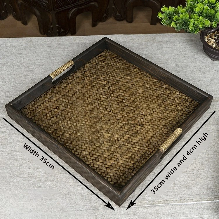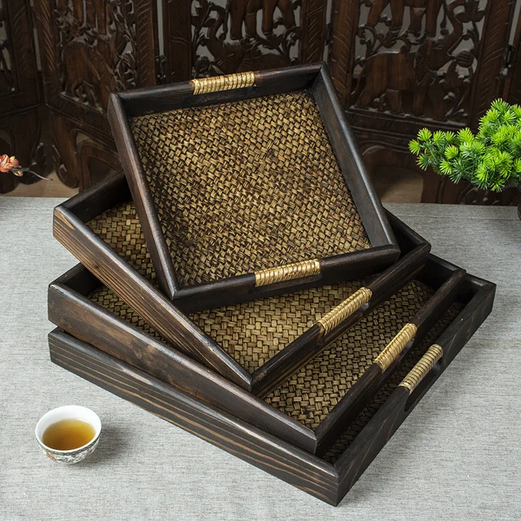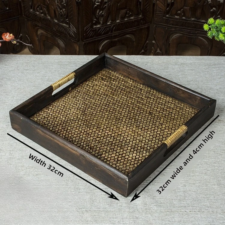 Thai Style Rattan Wooden Tray Southeast Asian Beauty Salon Hotel Tea Cup Storage Serving Tray